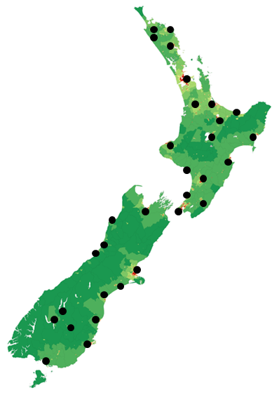 Кайтайя — 92.4FM, Залив Островов — 94.4FM, Кайкохе — 92.4FM, Вангарей — 92.4FM, Окленд — 1476AM, Вайкато — 954AM, Таурага — 873AM, Роторуа — 1548AM, Вакатане — 96.1FM, Таупо — 91.2FM, Гисборн — 1485AM, Таранаки — 97.2FM, Хокс-Бей — 549AM, Вангануи/Манаваты — 828AM, Вайрарапа — 91.1FM, Капити-Кост — 93.5FM, Веллингтон — 711AM, Нельсон — 990AM, Вестпорт — 93.3FM, Грейсмут — 93.9FM, Хокитика — 89.1FM, Крайстчёрч — 1260AM, Эшбёртон — 1071AM, Тимару — 1242AM, Оамару — 89.6FM, Данидин — 1206AM, Центральный Отаго — 104.7FM, Ванака — 106.8LPFM, Куинстаун — 93.6FM, Инверкаргилл — 1224AM.